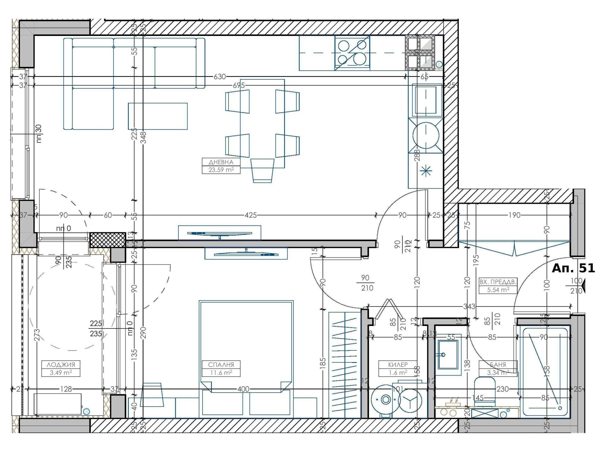 - Двустайните апартаменти, с изложения на изток и запад, предлагат просторни дневни зони с много естествена светлина и удобно разпределение на помещенията. Те са перфектни за малки семейства или хора, които търсят уютно жилище с модерен стил.