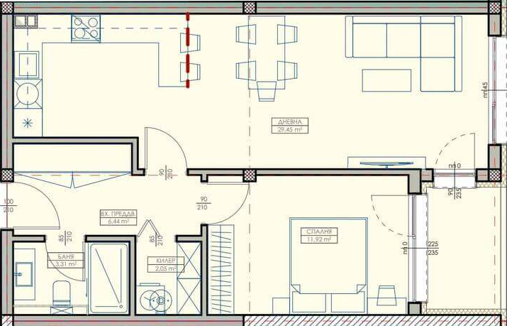 Апартамент – Дневна с кухненски бокс, спалня, баня с тоалетна, килер, входно преддверие и лоджия