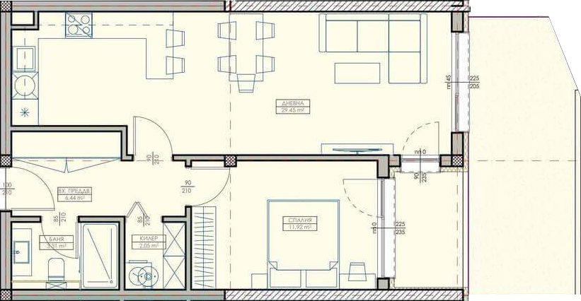 Апартамент – Дневна с кухненски бокс, спалня, баня с тоалетна, килер, входно преддверие и лоджия