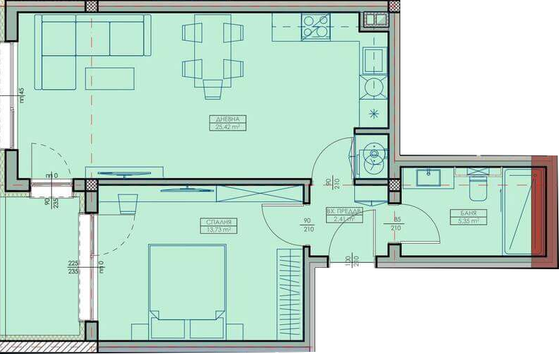Апартамент – Дневна с кухненски бокс, спалня, баня с тоалетна, килер, входно преддверие и лоджия