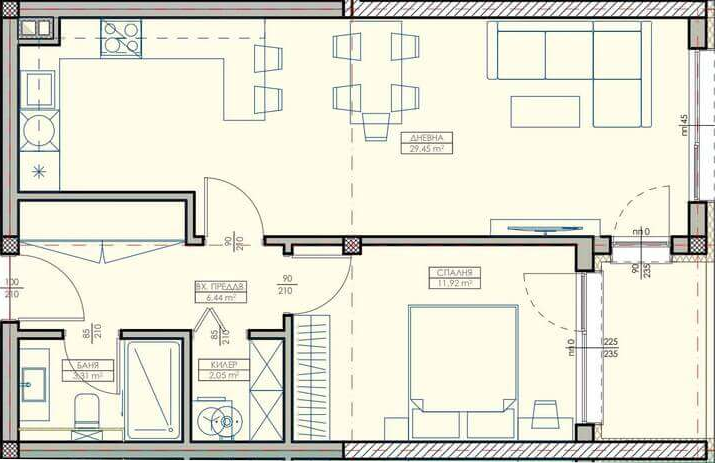 Апартамент – Дневна с кухненски бокс, спалня, баня с тоалетна, килер, входно преддверие и лоджия