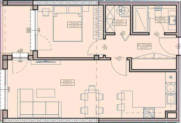 Апартамент – Дневна с кухненски бокс, спалня, баня с тоалетна, килер, входно преддверие и лоджия