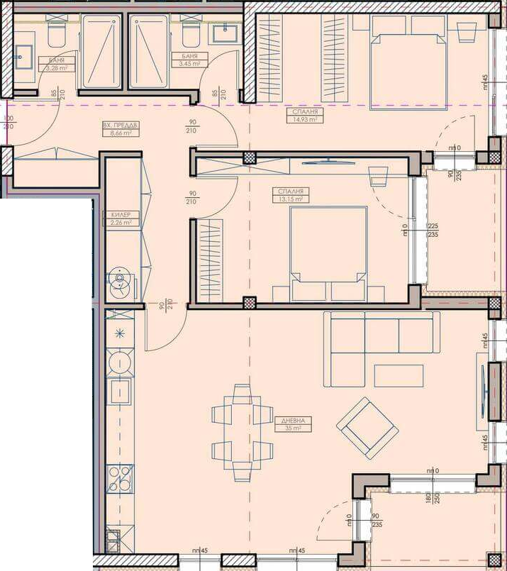 Апартамент – Дневна с кухненски бокс, 2 спални, 2 бани с тоалетна, килер, входно преддверие и 2 лоджии